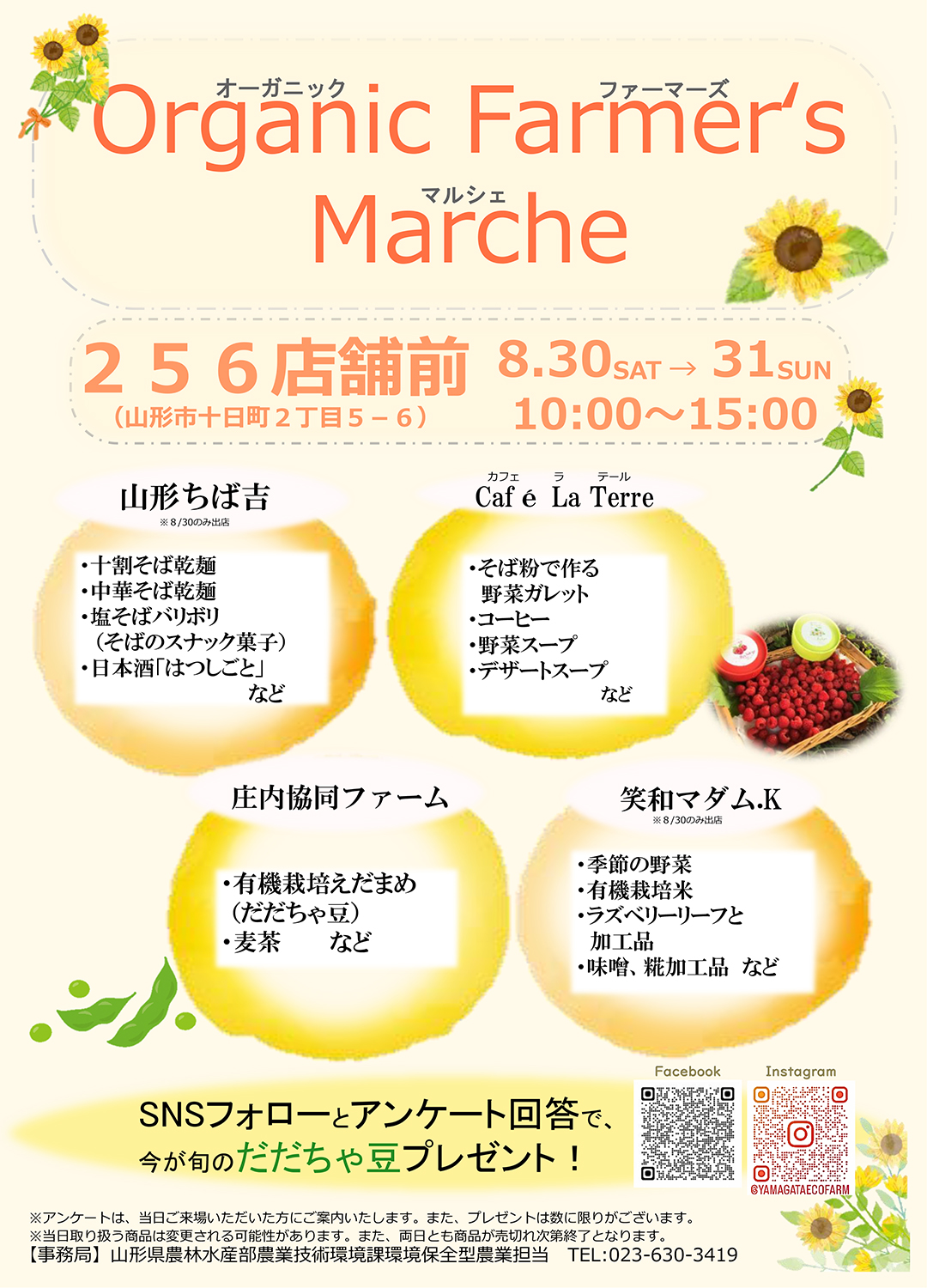 山形県の環境に優しい農業をたくさんの方に知っていただけるように、「オーガニックファーマーズマルシェ」を開催します。
