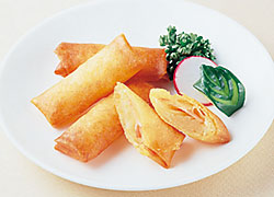 - 春巻きの皮にベーコン、玉ねぎ、ラ・フランス、玉ねぎと順にのせて、塩こしょうをふって包む。