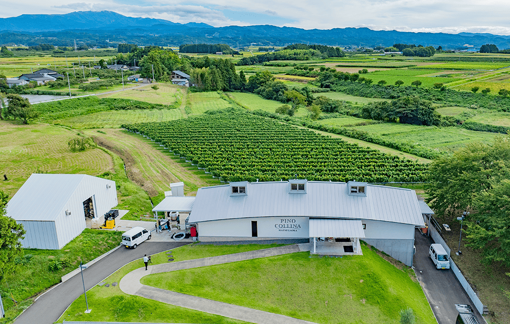 ピノ・コッリーナがある松ヶ岡は、庄内の歴史と風景が息づく特別な場所です。かつて庄内藩士たちが開墾し、シルク産業を興したこの地は、庄内柿や桃の畑として実りを支え、現在ではワイン用ぶどうの栽培も行われる、果実の歴史が重なる土地となりました。丘陵地に広がるぶどう畑は、イタリア・ピエモンテ州のランゲの丘を思わせる美しさから、ワイナリーのオーナーはここを選んだのだとか。ほかにもレストランやワイン醸造施設が併設されており、庄内の食と風景を五感で味わえる空間が広がっています。そしてこの場所では、結婚式も挙げられる─そんな奇跡のようなロケーションが、今回の夢婚をより特別なものにしてくれました。