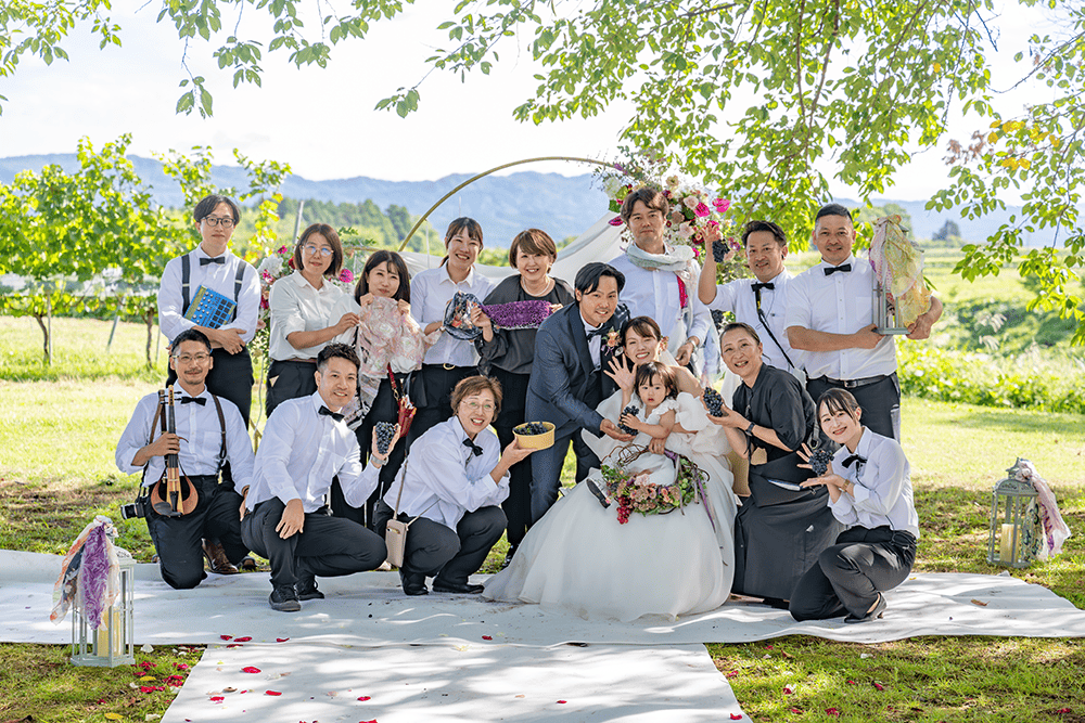 一方、やまがたフルーツ150周年記念のさまざまな取り組みは、県産果実という地域資源を通じて、交流人口の創出や地域の魅力発信のきっかけになっています。きっと、今回の夢婚に参列した方々にとって、ぶどう畑の風景は忘れられない記憶となったことでしょう。