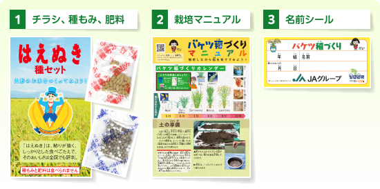 ポリバケツ(10〜15リットル)、土(黒土6、赤玉土3、鹿沼土1)をご用意いただき、栽培マニュアルにより稲を育ててください。