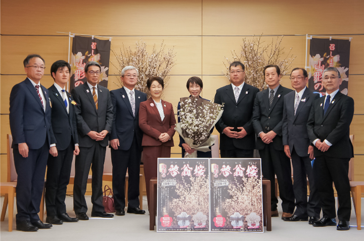 令和8年1月9日(金)、首相官邸で吉村知事と西川町の生産者などが高市総理に啓翁桜をプレゼントしたペロ。