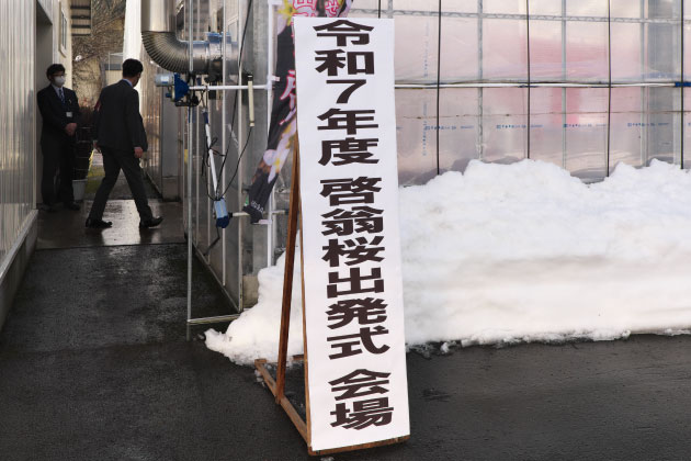 西川町吉川の促成・集出荷施設で、町やJAの職員など約30人の関係者が出席して行われた啓翁桜の出発式。厳かに神事が執り行われ、神主の祝詞奏上に続いてJAさがえ西村山・安孫子常哉組合長が玉串を捧げ、品質のいい啓翁桜を安全に出荷できるよう祈願したペロ。