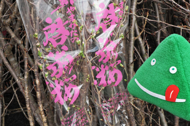 山形の啓翁桜には、用途や枝のボリュームに応じていろいろなサイズがあるペロ。一般の家庭で飾りやすい「スリーブ規格」は、専用のスリーブ(透明の袋)に80cm前後の啓翁桜が2〜3本程度束ねられているもの。僕もお友だちの「ガッさん」からプレゼントされた啓翁桜を、さっそくお家に飾るペロ♪