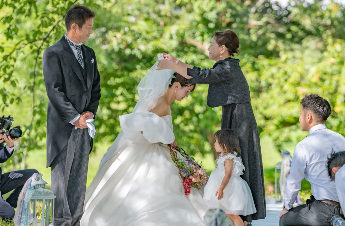 今回の夢婚が行われたのは、鶴岡市松ヶ岡にある「ピノ・コッリーナ ファームガーデン&ワイナリー」。木漏れ日が差し込む会場の背後には、月山とぶどう畑が広がり、秋晴れの空が優しく見守っていました。人前式は静かに始まり、親族や友人の視線の先にある、新郎の佐藤 一さん、新婦の奈月さん、そして愛娘の翠衣ちゃんが歩む姿は、映画の1コマのよう。庄内の風土に育まれたふたり、そしてぶどうが大好きな親子の想いが重なり合い、祝福の空気に包まれました。