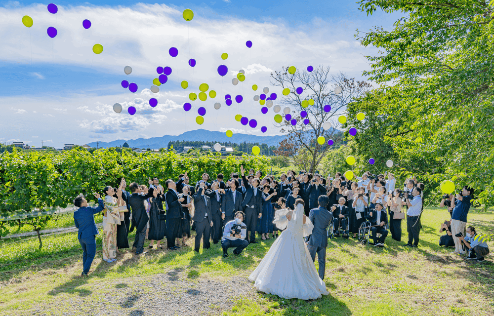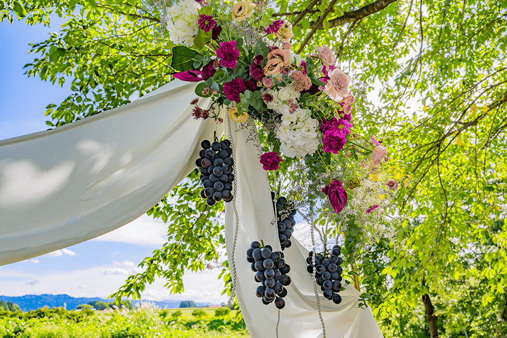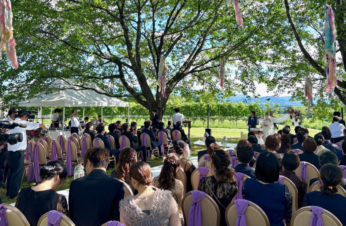 一方、やまがたフルーツ150周年記念のさまざまな取り組みは、県産果実という地域資源を通じて、交流人口の創出や地域の魅力発信のきっかけになっています。きっと、今回の夢婚に参列した方々にとって、ぶどう畑の風景は忘れられない記憶となったことでしょう。