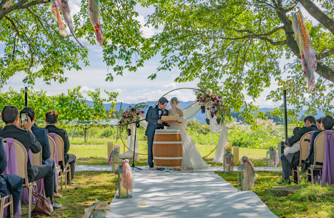 150年もの間、人々の暮らしに寄り添い、季節の彩りを届けてきた山形の果実。やまがたフルーツ150周年の節目の年、庄内のワイナリーで、ひと組の家族が未来への誓いを立て、新たな一歩を踏み出しました。山形の果実にあふれる景色の中で、大切な人たちに感謝を伝えたい──そんな想いから始まった“ワイナリー夢婚”。果実の香りと人の笑顔に満ちた、かけがえのない一日となりました。